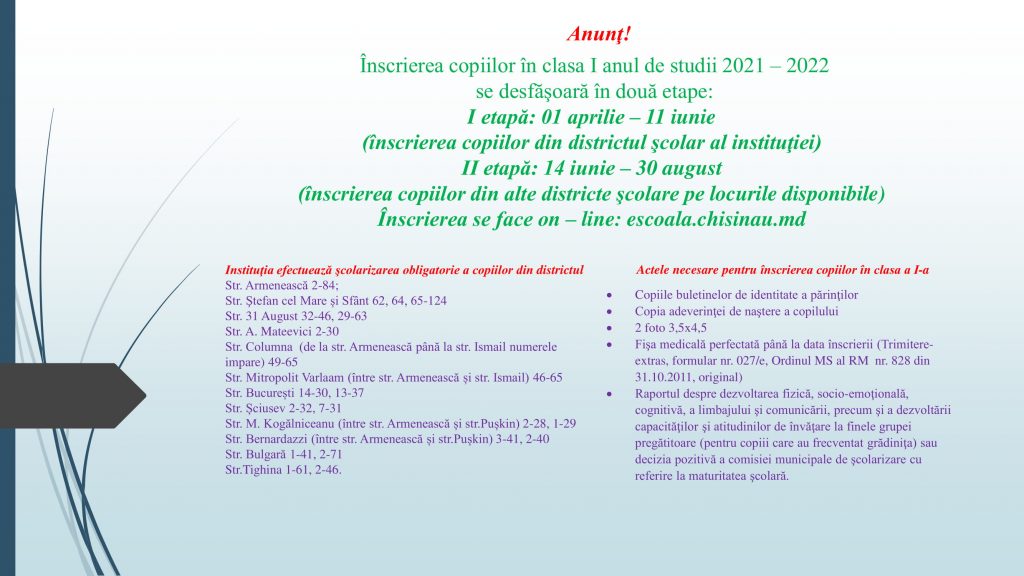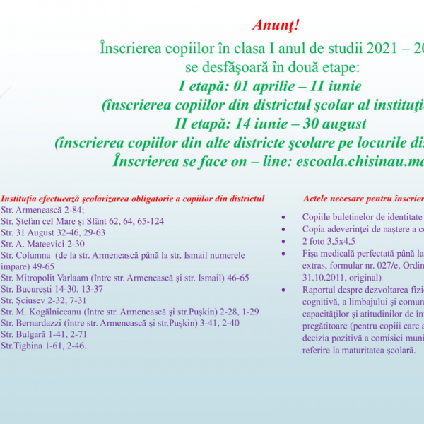 ANUNŢ! ÎNMATRICULAREA ÎN CLASA I
