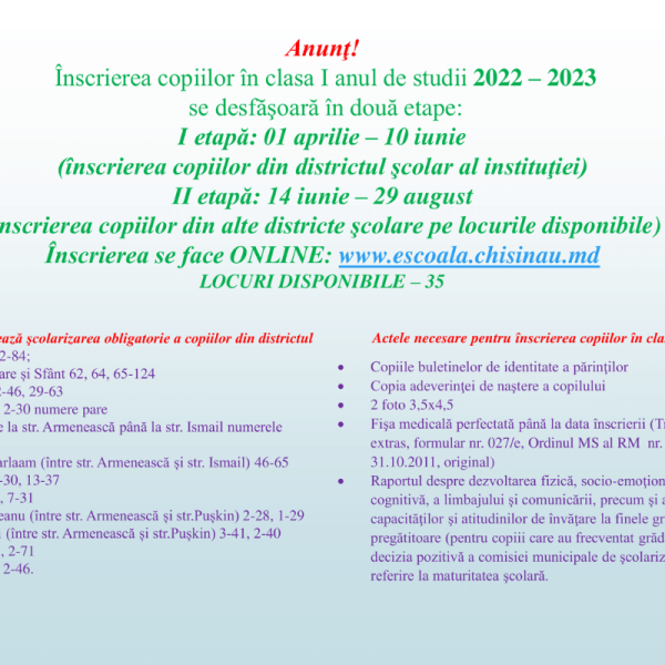 Înscrierea copiilor în clasa I anul de studii 2022 – 2023