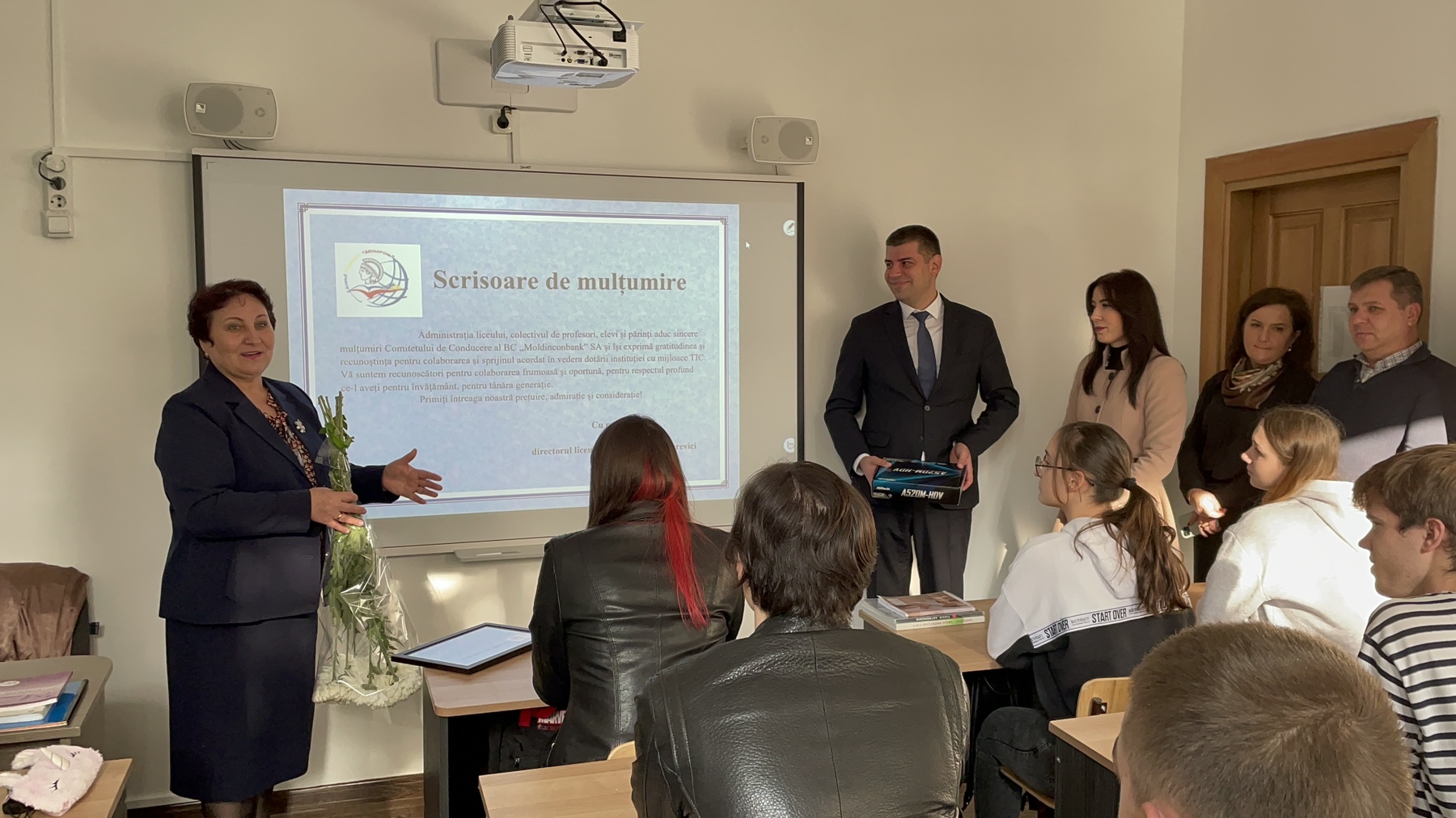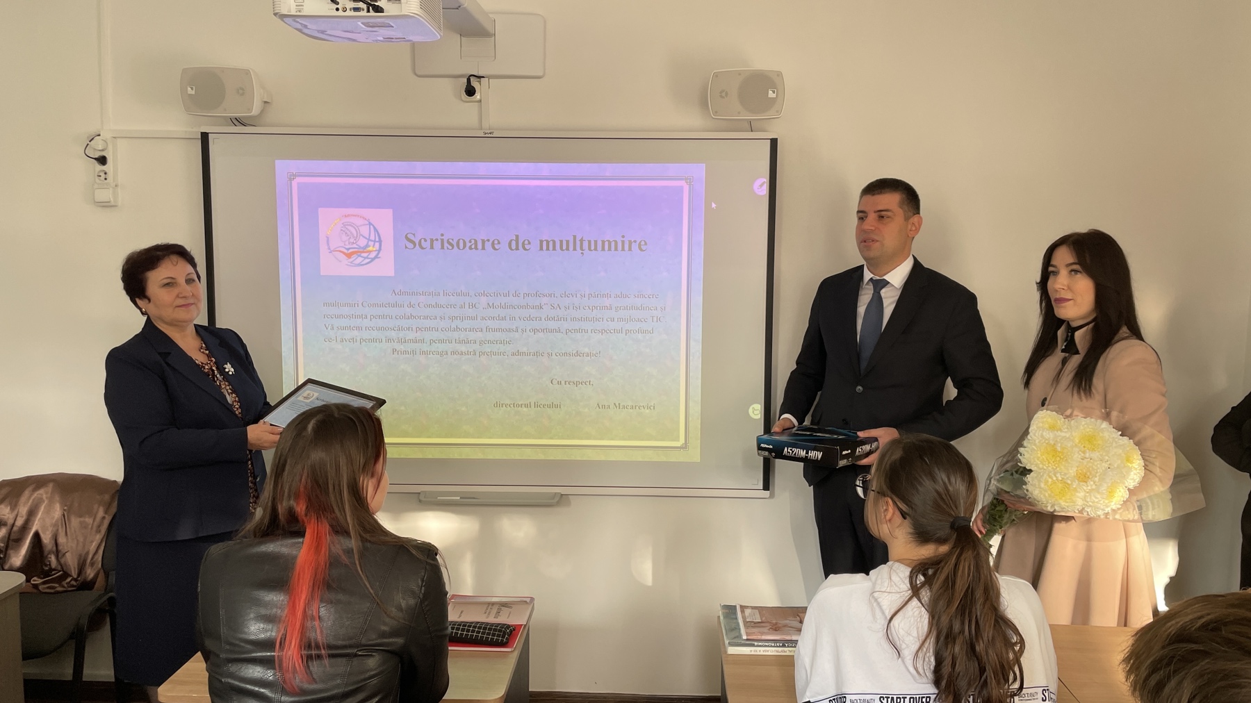 Administrația liceului, colectivul de profesori, elevi și părinți aduc sincere mulțumiri Comitetului de Conducere al BC „Moldinconbank” SA și își exprimă gratitudinea și recunoștința pentru colaborarea și sprijinul acordat în vederea dotării instituției cu mijloace TIC.