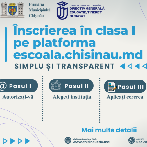 ℹ️ Campania dată conjugă eforturile noastre spre asigurarea unui ajutor continuu părinților. În acest sens, îi îndemnăm pe părinți să se informeze cu privire la procesul de înscriere și instrucțiunile de aplicare pentru clasa I pe platforma www.escoala.chisinau.md.